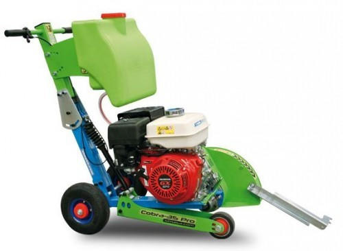 A Cobra 30/35 Pro egy könnyű, gyors és könnyen használható aljzatvágó gép, amely 300 mm, 350 mm , 400 mm átmérőjű tárcsákkal szerelhető. Az innovatív kialakítás csökkenti a tárcsák cserélési idejét, a jól hozzáférhető és az alkatrészek karbantartási ideje is nagyon rövid, üzemeltetési költségei rendkívül alacsonyak. COBRA 35 PRO Motor Honda GX-270 Üzemanyag Benzin Teljesítmény 8,4Le Motor fordulat 3600 Max. tárcsa átmérő Max. Vágási mélység 350 /400 mm135 / 160 mm Max. tárcsa furat átmérő 25,4 mm Vágó tárcsa elhelyezése Bal oldalt Víztartály kapacitása 20 l Súly 72 kg Vágási mélység állítás gázteleszkóp segítségével Méret 1325*696*1015 mm